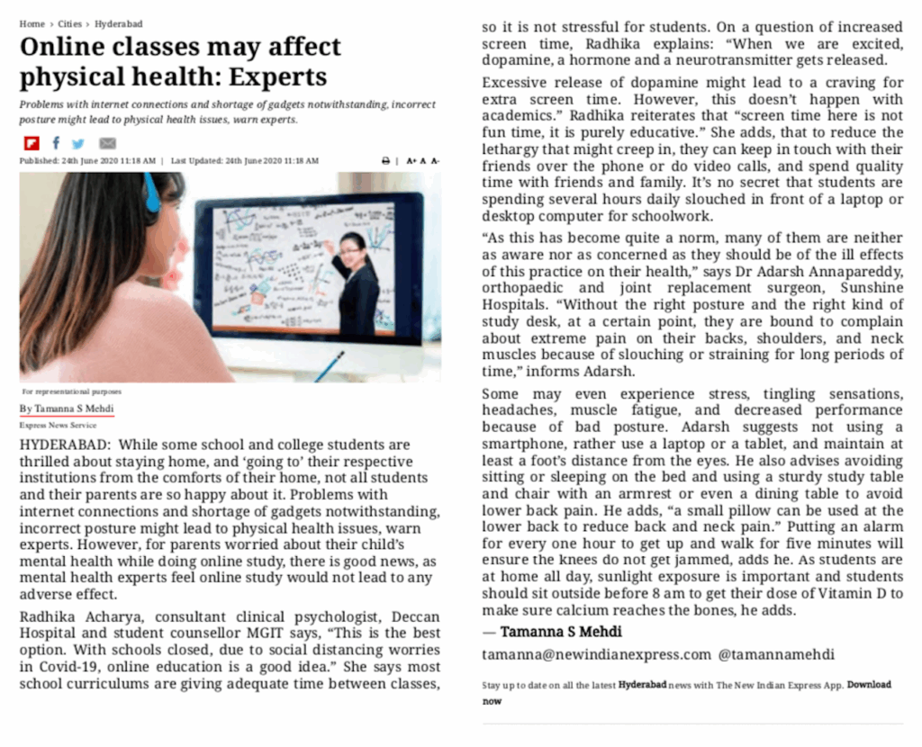 Effect of online classes on physical health | New Indian Express | Dr. Adarsh Annapareddy | Sunshine Hospitals